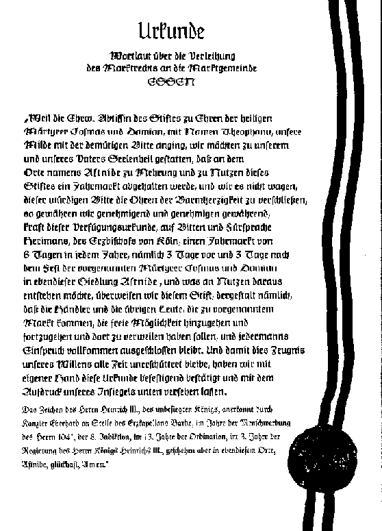 Es ist fraglich, ob die im Jahre 1041 verliehene Urkunde die erste Urkunde darstellte, durch die der Stadt Essen das Marktrecht verliehen wurde oder ob durch diese Urkunde nur die Erweiterung oder gar nur die Bestätigung eines schon bestehenden Rechtes ausgesprochen wurde. Urkunden über ein Marktrecht für Essen aus früherer Zeit sind nicht bekannt geworden. Aufgestellt im Sommer 1958 nach Unterlagen des Essener Stadtarchivs.